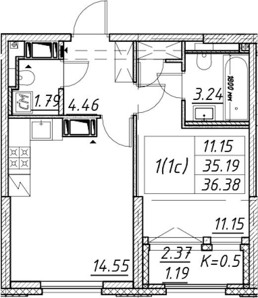 • Площадь36,38 м2
