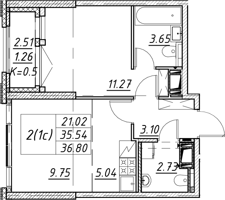 - Площадь36,8 м2