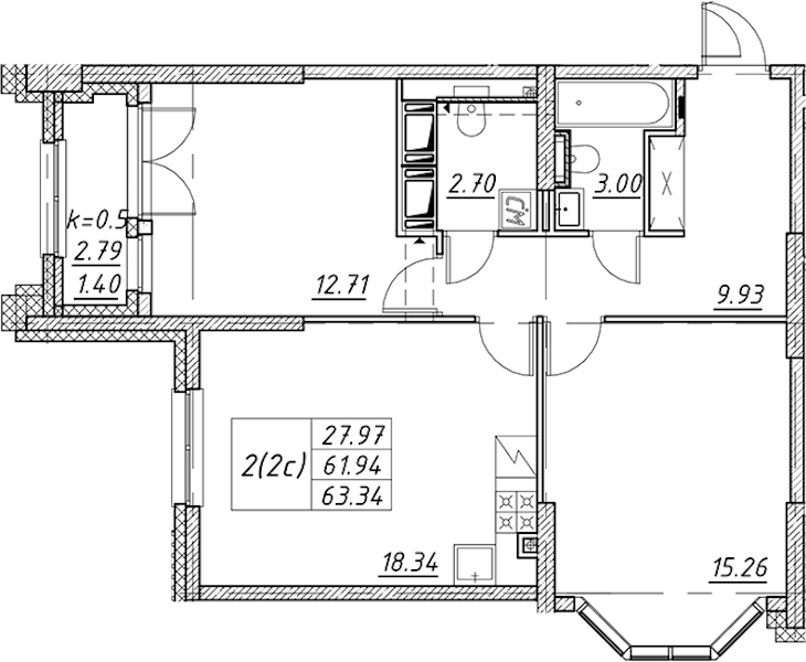 - Площадь63,34 м2