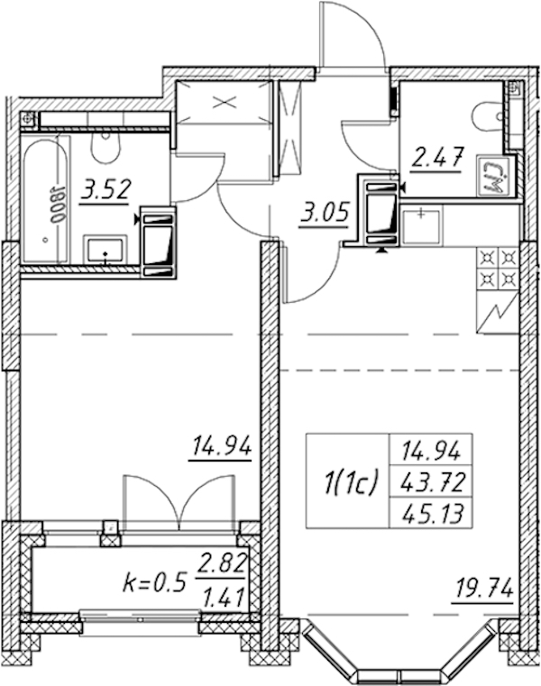 - Площадь45,13 м2