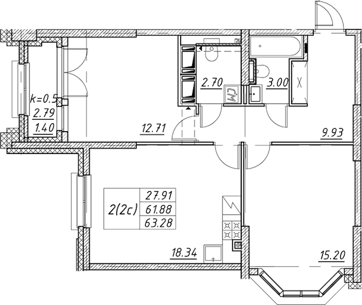 Двухкомнатная квартира на 14-ом этаже 63,28 кв.м