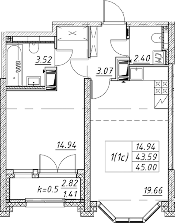 Однокомнатная квартира на 17-ом этаже 45 кв.м
