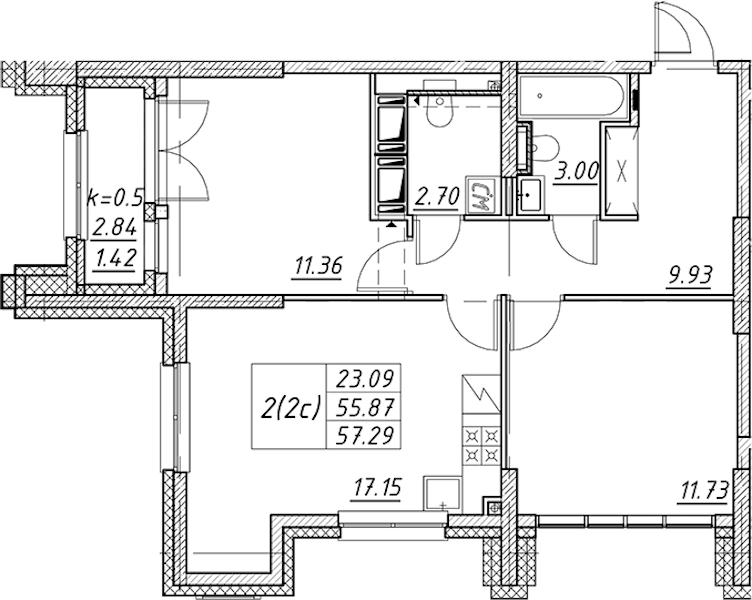 - Площадь57,29 м2
