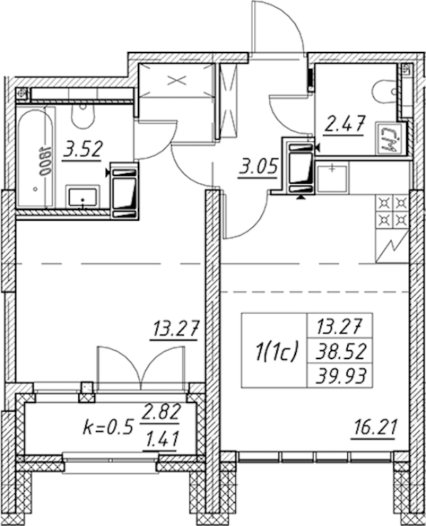 Однокомнатная квартира на 22-ом этаже 39,93 кв.м
