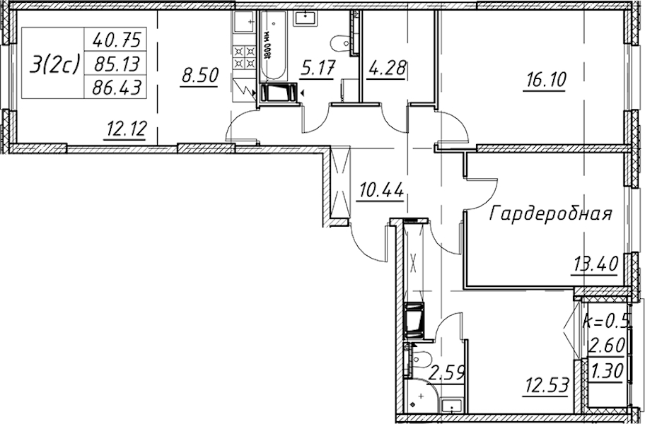 Двухкомнатная квартира на 10-ом этаже 86,43 кв.м