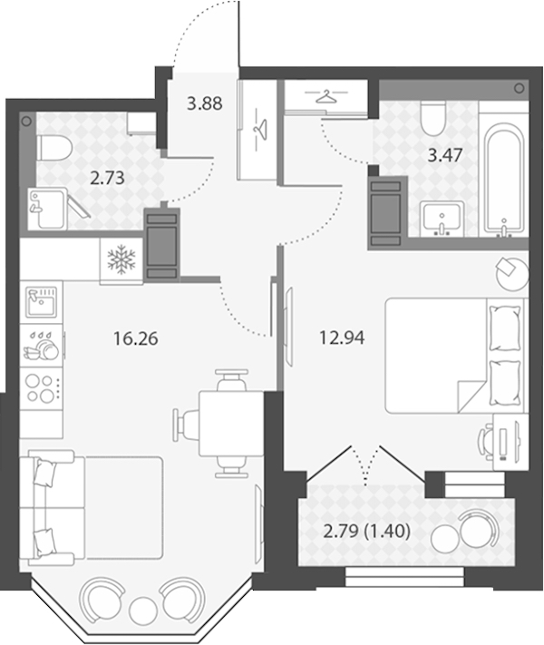 Однокомнатная квартира на 10-ом этаже 40,68 кв.м