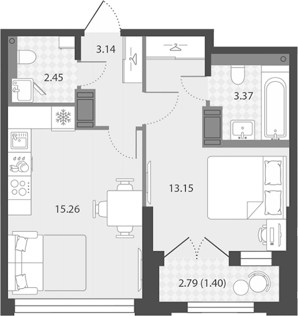 Однокомнатная квартира на 17-ом этаже 38,77 кв.м