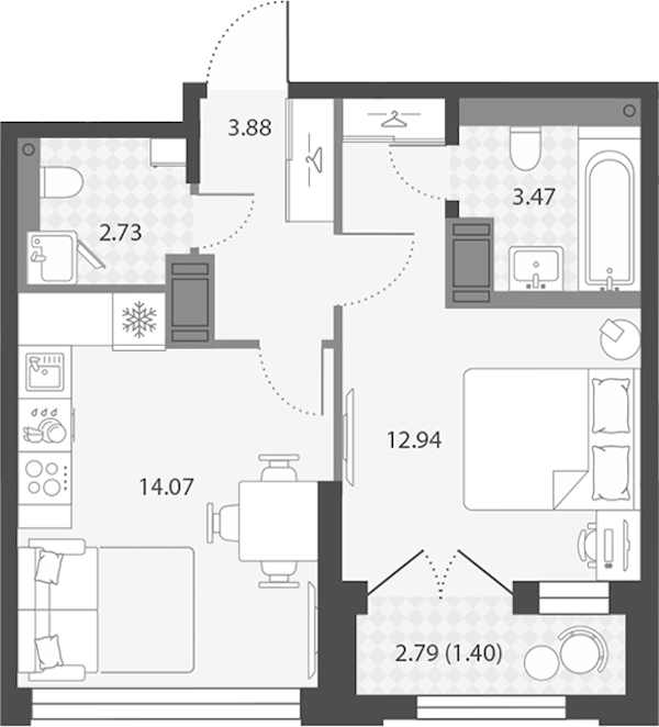 Однокомнатная квартира на 17-ом этаже 38,49 кв.м