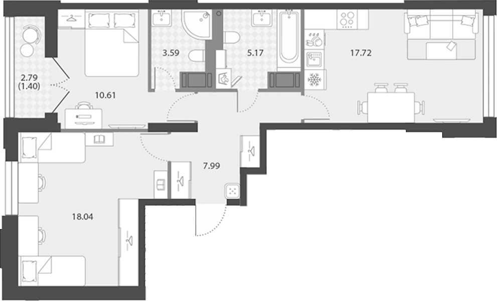 - Площадь кухни17,72 м2