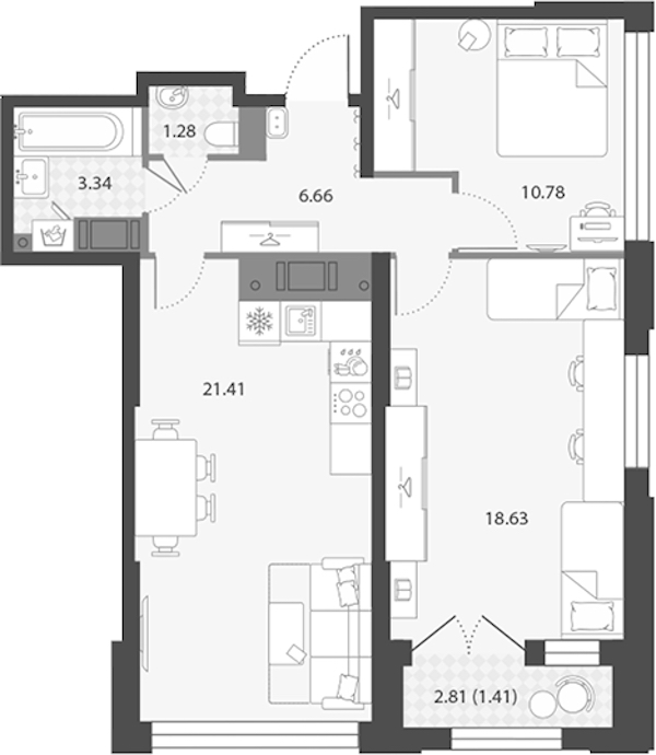 Двухкомнатная квартира на 15-ом этаже 63,51 кв.м