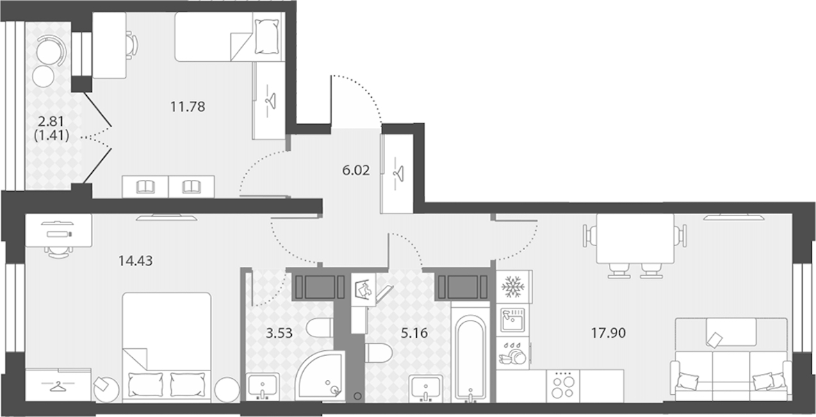 Двухкомнатная квартира на 16-ом этаже 60,23 кв.м