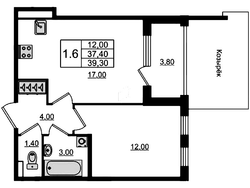- Площадь37,4 м2
