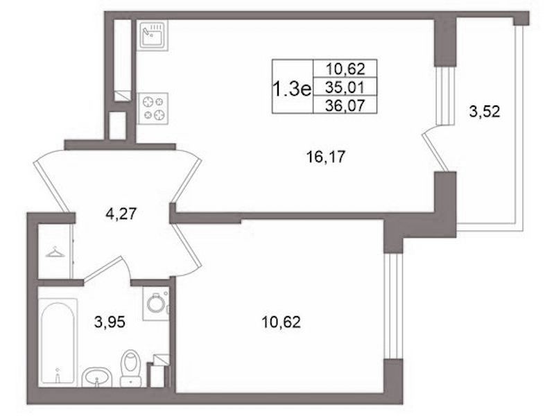 Однокомнатная квартира на 3-ем этаже 35,01 кв.м