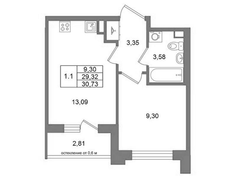 Однокомнатная квартира на 1-ом этаже 29,32 кв.м