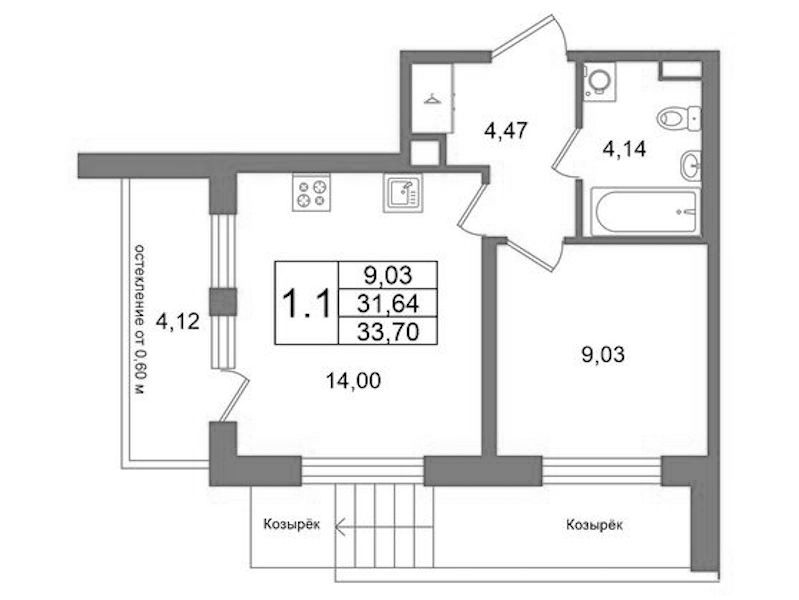 Однокомнатная квартира на 1-ом этаже 31,64 кв.м