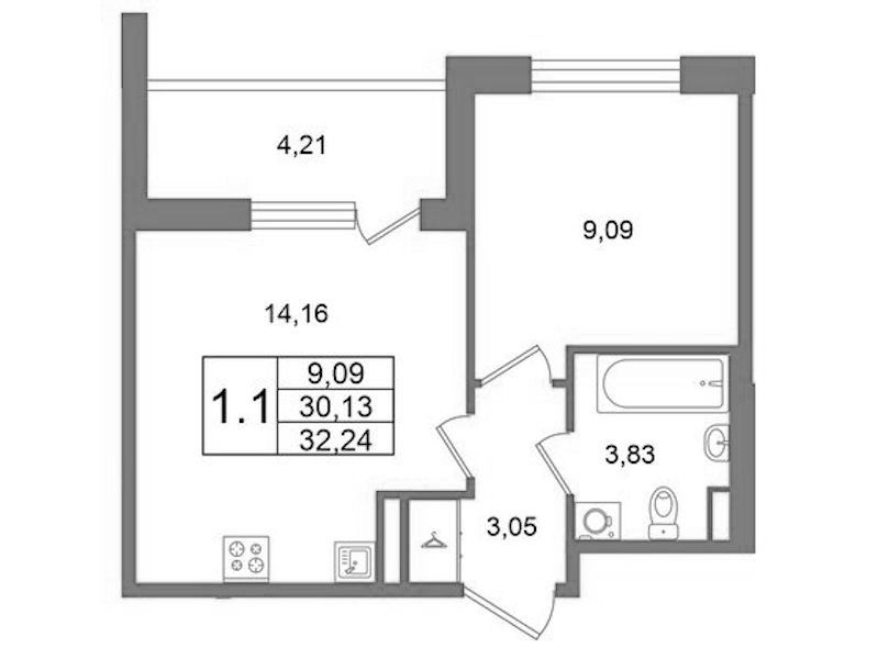 Однокомнатная квартира на 1-ом этаже 30,13 кв.м