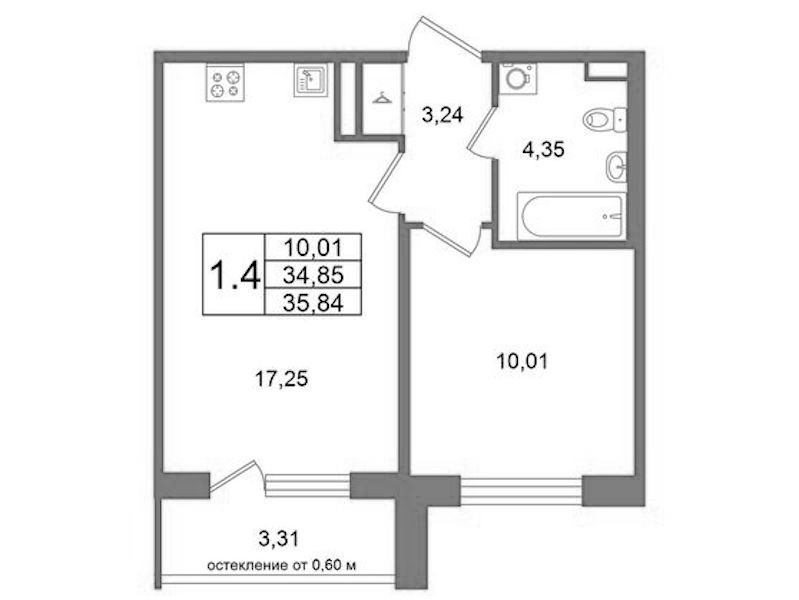Однокомнатная квартира на 1-ом этаже 34,85 кв.м