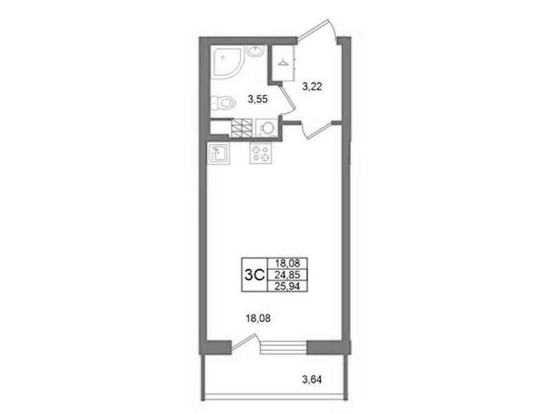 Квартира-студия на 4-ом этаже 24,85 кв.м