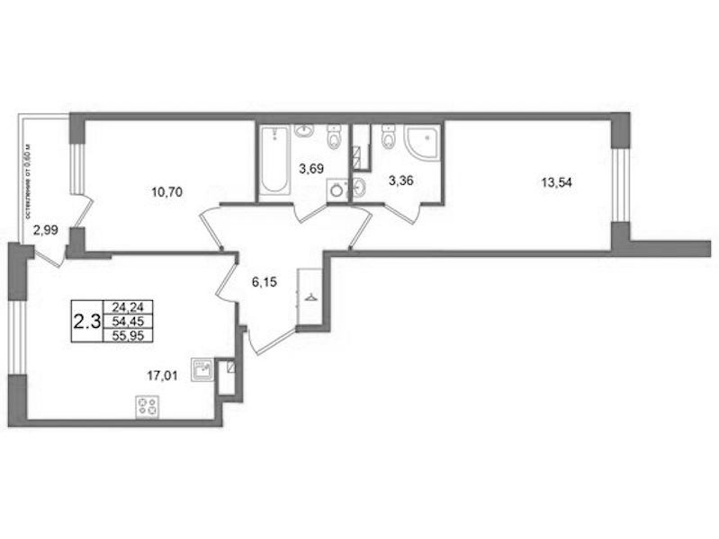Двухкомнатная квартира на 3-ем этаже 54,45 кв.м