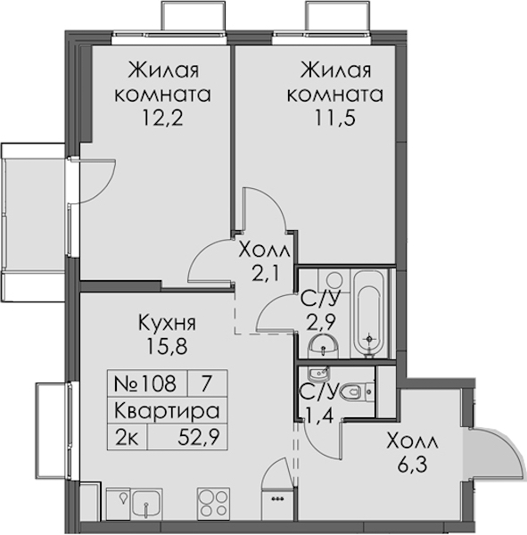 Двухкомнатная квартира на 10-ом этаже 52,9 кв.м