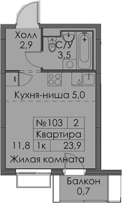 Квартира-студия на 6-ом этаже 23,9 кв.м