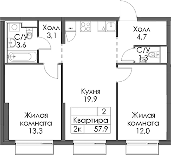 Двухкомнатная квартира на 12-ом этаже 57,9 кв.м