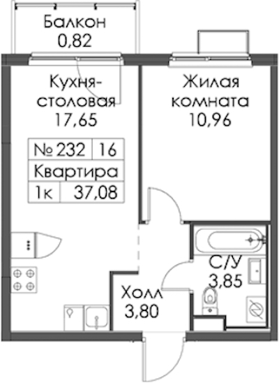 Однокомнатная квартира на 17-ом этаже 37,08 кв.м