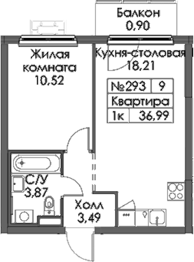 Однокомнатная квартира на 21-ом этаже 36,99 кв.м