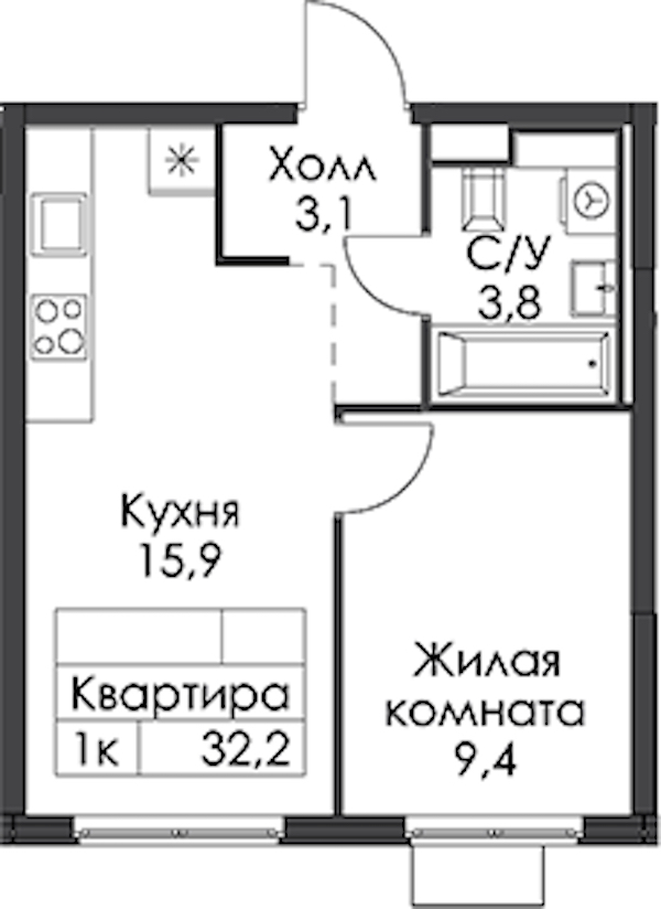 Однокомнатная квартира на 22-ом этаже 32,2 кв.м